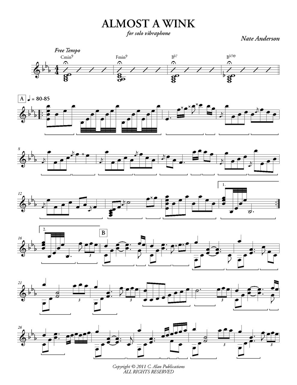Almost a Wink is a jazzy, melodically-driven work for solo vibraphone, giving the performer the opportunity to add his or her personal touch through improvisation. A perfect piece for an undergraduate percussion recital.