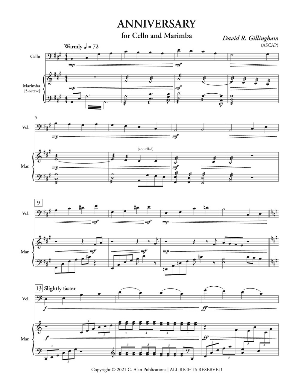 Originally a solo piano piece that Gillingham wrote for his wife on their 7th wedding anniversary, he re-imagined it for cello and marimba for his daughter's wedding. This beautiful arrangement showcases the musical union of the two instruments and is perfect for any event or recital.