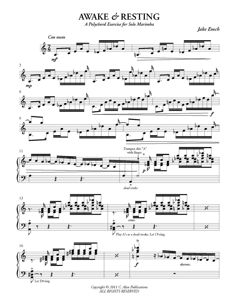 Awake & Resting, for four-mallet marimba, was written in February of 2011 with the goal of using two central tonalities. A minor and D flat major are highlighted in this piece and keep the listener guessing at the overall "tonic." It may be advisable to set two mallets down at the end of measure 40 in order to really hit the sforzando at 48 (and make your audience jump!). Pick them back up again before 53.
