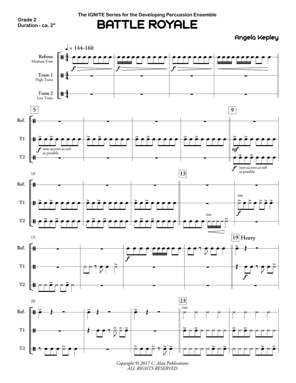 The “referee” monitors the Battle Royale between two teams. This piece requires each team to work together to create a monstrous sound and battle out their rhythms. Each side has contrasting rhythmic patterns as they challenge the other for dominance. The referee must occasionally interject until they all join in unison for a final push to the finish. Which team wins? You decide!