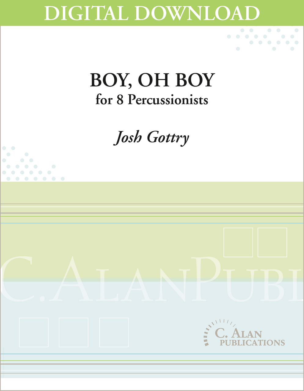 Written for my one-year-old son Caleb, this piece opens with a simple lullaby setting of a Swedish folk melody from the hymn Children of the Heavenly Father. At the presto, a day begins with the woodblock part signifying the continual progression of time. The texture gradually thickens as toys are strewn around the house. The chord progression beginning five bars after letter A, spells out Caleb’s name (Cmin, Abmin, Fmin7 substitute for “L” Eb, Bb). The progression is then restated with a slightly busier ostinato. The hymn melody returns over new ideas in the mallet instruments, while the snare, woodblocks, and hand drums continue the 5/4 patterns into the 4/4 time signature. A final statement of the chord progression is made at letter F followed by the gradual thinning of the texture as the day winds down. A short lullaby recap closes the piece and the woodblock begins again to serve as a reminder that the next day is coming soon. - Josh Gottry