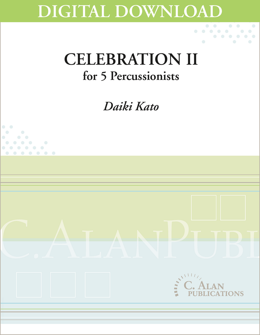 Celebration II is a colorful, exciting opener or closer for 5 players on one 5-octave marimba. It is also available for 3 players on one 4-octave marimba under the title Celebration III.