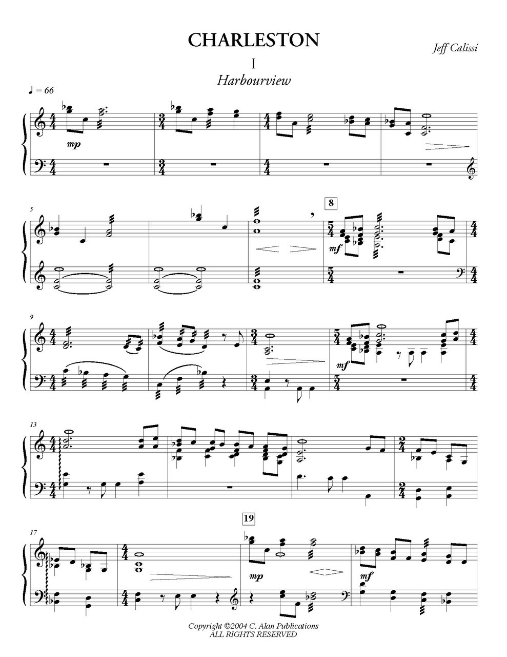 Charleston is meant to depict experiences in the city of Charleston, SC. The first movement Harbourview is an unhurried chorale-like setting with several short motives that reflect the peaceful motion of the harbor surrounding the city of Charleston. The second movement, Market and Meeting is an active movement that imitates much of the same liveliness found at the intersection of Market and Meeting Streets in Charleston, South Carolina.