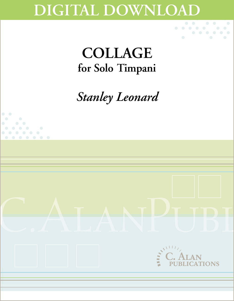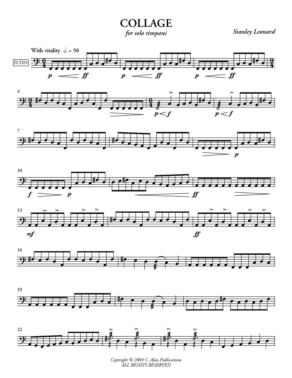 Timpani tunes in a melodic fashion utilizing the pedals for more than just changing pitches. The title, Collage, refers to music in the slow section that hints at timpani solos appearing in well-known orchestral works. The references are not exact statements but will be recognized by the experienced timpanist.