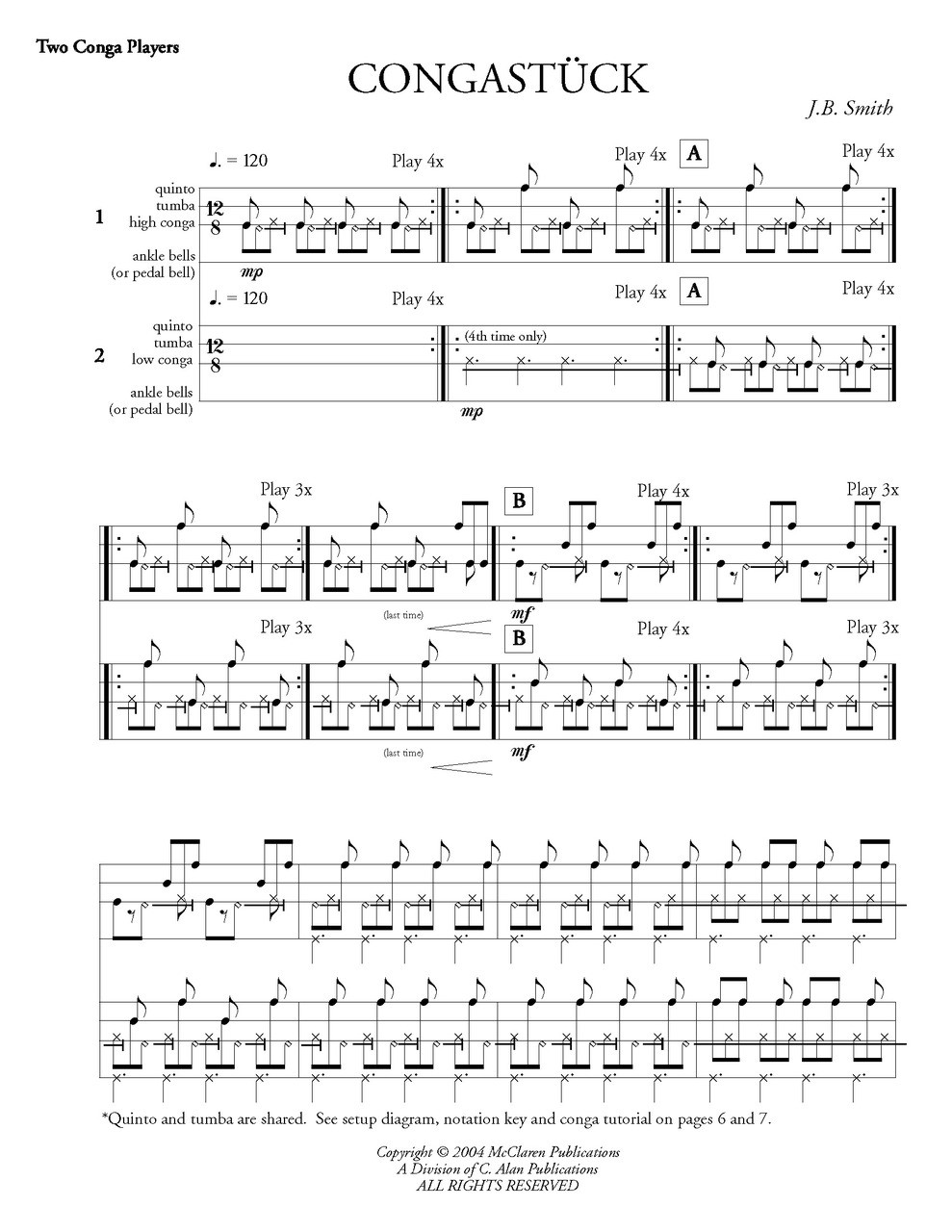 J.B. Smith is one of the first to notate conga playing in this duet for two conga players. Very clear diagrams and illustrations aid even the most inexperienced conga player. Each player uses three congas (quinto, tumba, and high or low conga) and ankle bells. The piece is set completely in 12/8 and provides opportunities for improvisation.