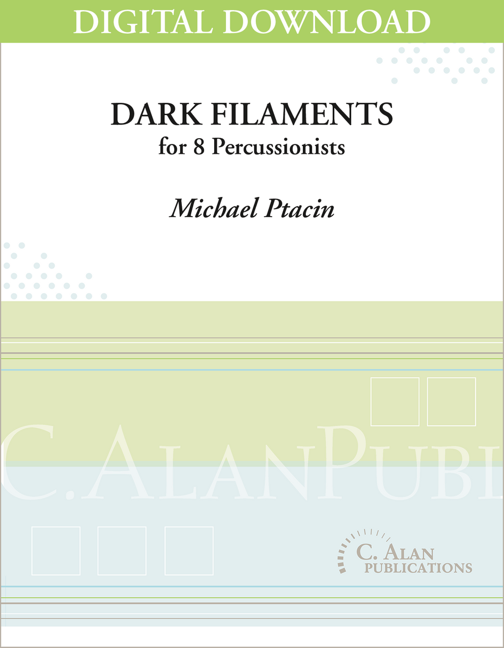 Dark Filaments was written for 8 players at the advanced middle school or beginning high school level. The title refers to two threads (filaments) that run throughout the work, one melodic and one rhythmic. The main melodic idea is presented in the bells in measure 7. The pitch set is limited to G-A-B-flat-D-E in order make it approachable for younger players who may be new to mallet percussion. The xylophone introduces the main rhythmic motive in measure 18, which later occurs in keyboard and non-pitched percussion instruments. Most players utilize multiple instruments throughout the work. A couple parts were written using only one or two instruments should navigating multiple instruments be difficult for some players.
