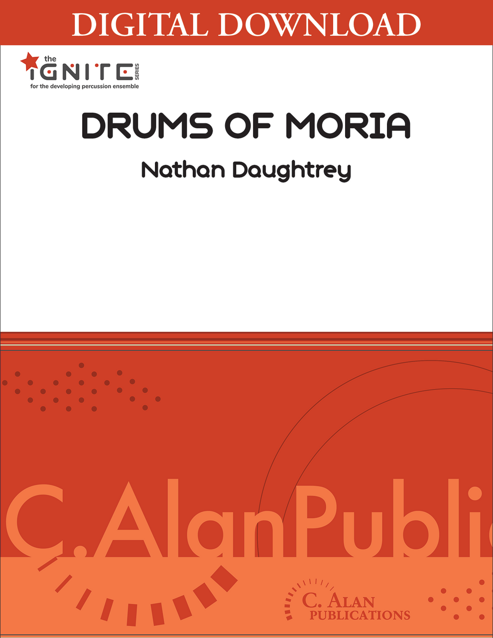 Originally for two toms found in Daughtrey's collection of duets for young percussionists, DUOLOGY, Drums of Moria has been expanded for full percussion ensemble for C. Alan's IGNITE SERIES. Inspired by the barbaric drums described in J.R.R. Tolkien's "Lord of the Rings," the piece uses two toms, bass drum, and two players on one xylophone in a variety of ways to evoke a range of dark images and moods.