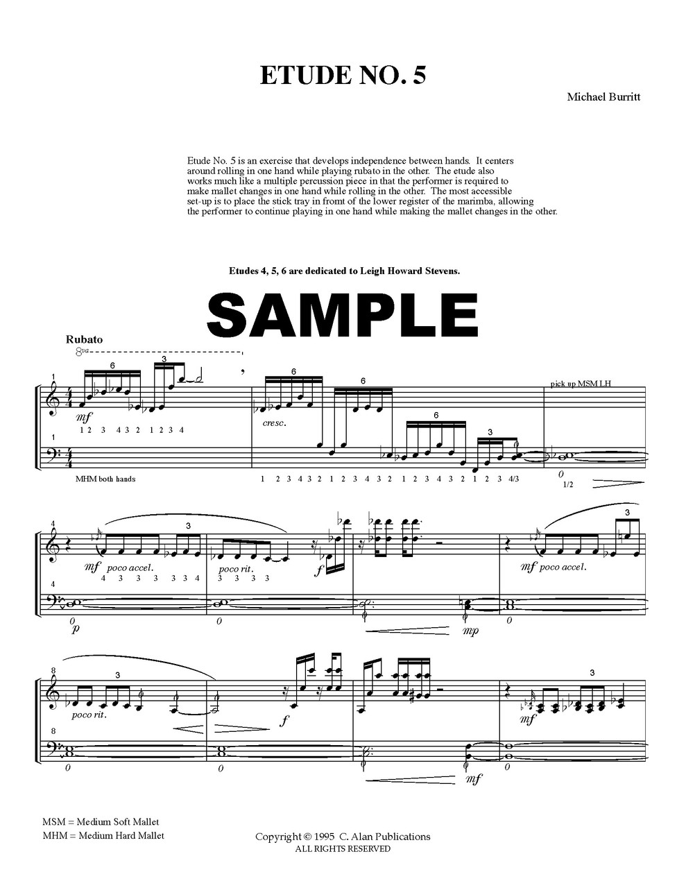 Etude No. 4 was conceived to develop dexterity, strength, and endurance in double lateral, four-mallet sticking technique. The sequential sticking pattern 123234 is a pattern I use in a variety of applications in everyday practice. Dedicated to Leigh Howard Stevens.
