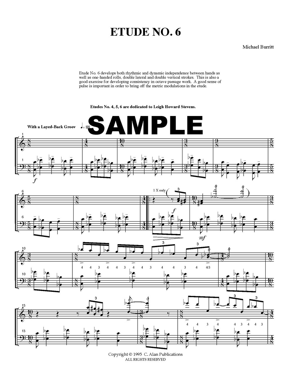 Etude No. 6 develops both rhythmic and dynamic independence between hands as well as one-handed rolls, double lateral and double vertical strokes. This is also a good exercise for developing consistency in octave passage work. A good sense of pulse is important in order to bring off the metric modulations in the etude. Dedicated to Leigh Howard Stevens.