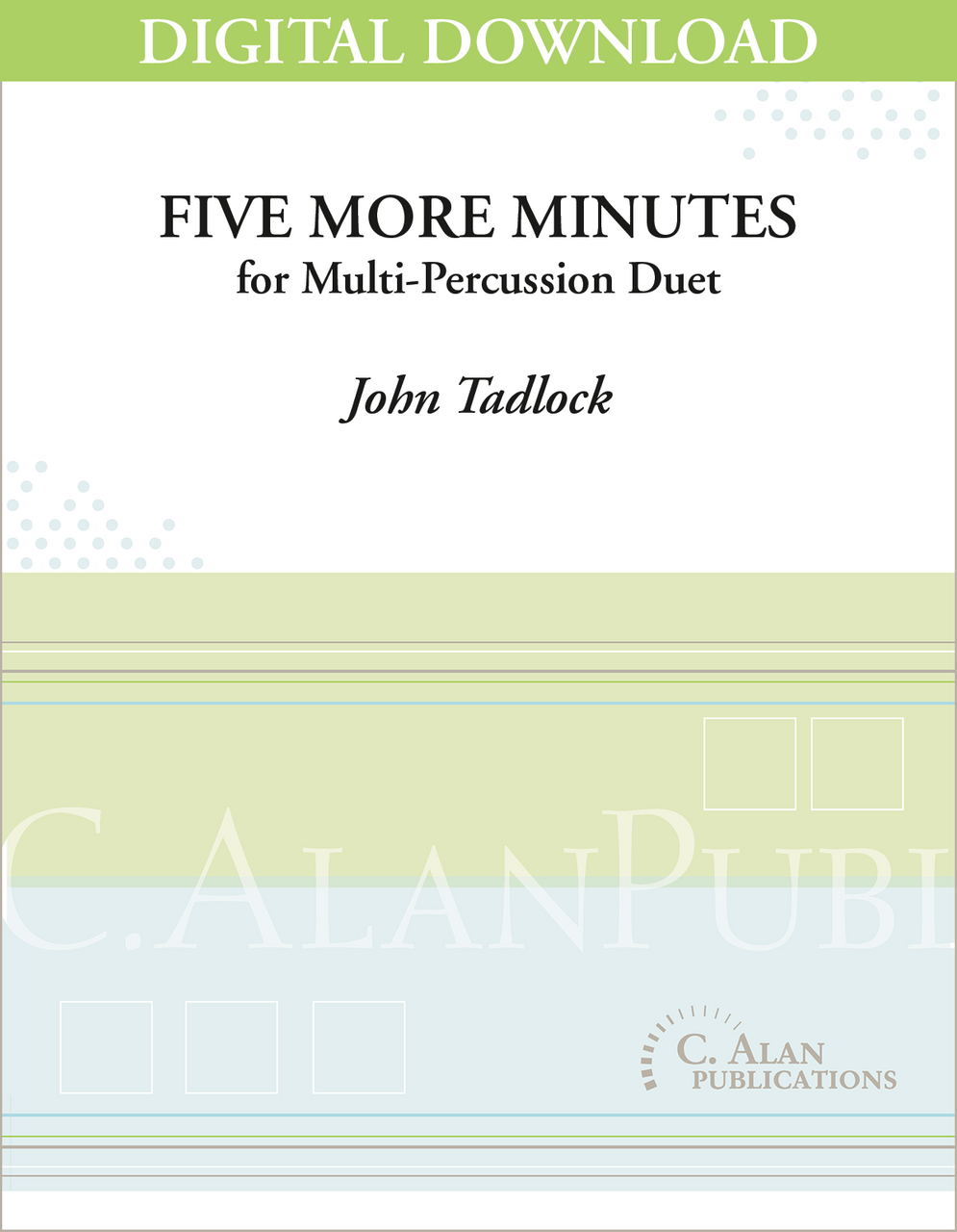 The work starts with solo clapping that quickly moves into a hocketed groove between the two players. This is followed by some tasty drum patterns played with brushes, Hot Rods, and eventually sticks (although it is not clear from the score and parts where this change to sticks actually occurs). There is also some rhythmic trading and echo effects during a mounted tambourine part played with both hands. “Five More Minutes” utilizes mixed meters and a variety of syncopated and thirty-second-note rhythms. The tempo of quarter note equaling 100 requires that the performers have strong single-stroke chops. I very much like the variety of timbres that John Tadlock gets from a relatively small number of instruments. The small setup is also appealing in that the work can easily be set up and torn down for each rehearsal. This work would be ideal for an undergraduate recital.