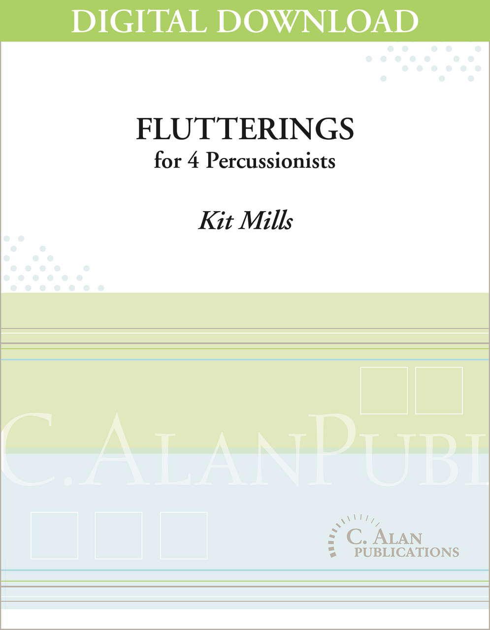 Flutterings features an almost constant rustling of sound, using a wide array of conventional auxiliary percussion instruments and some unconventional "found" instruments, most notably small pillows, hand towels, and cardboard squares (or boxes). Written with the idea that each percussionist could pack all (or most) of his required gear into a suitcase, Flutterings relies on idiomatic percussion rhythms while avoiding the frequent bombastic nature of "drumming music." Idiomatic though its rhythms may be, Flutterings often requires the overlapping of contrasting rhythms and beat subdivisions between players, resulting in complex cross-rhythms that camouflage the basic pulse. Set mainly in 3/4 meter, the work draws heavily upon two main rhythms, a driving straightforward 16th note feel and the basic "jazz ride" feel. These rhythms appear in various guises, starting on various beats of the measure, and using various note durations. Listeners may find themselves tapping their foot to the groove one moment, and wondering where the true pulse is in the next. The colorful variety of instruments used ensures that the percussionists' "flutterings" continually change colors as the music moves onward. I hope you enjoy seeing and hearing percussion in some new ways as you experience this fun piece.
