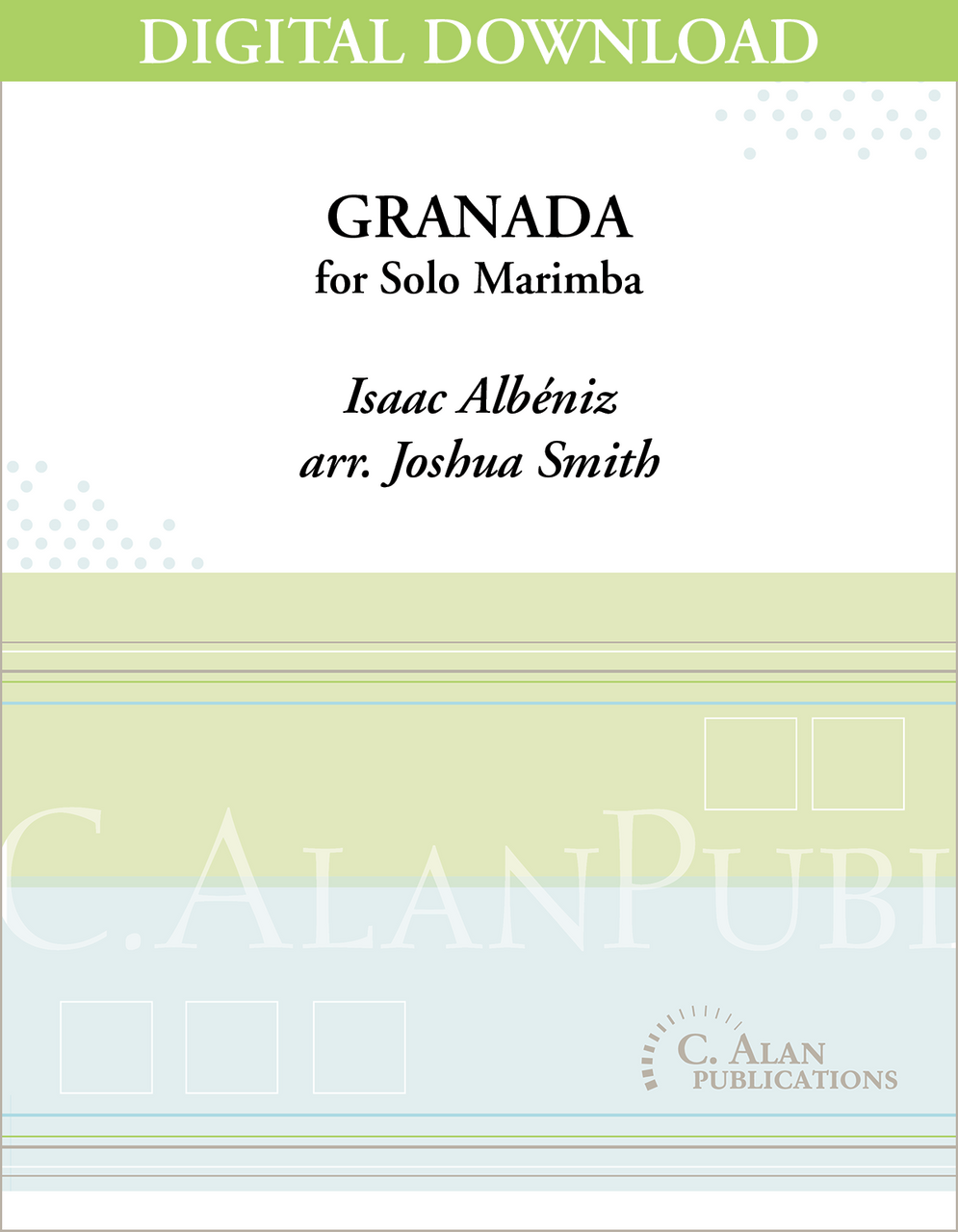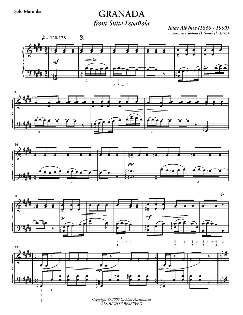 During his career, Isaac Albeniz (1860-1909) established himself as one of Spain's foremost musicians. Through his activities as a conductor, impresario, performer and composer within Spain, as well as abroad, Albeniz not only contributed to the rebirth of Spanish nationalism, but also gained international recognition for Spanish music. Granada, the first movement of his Suite Espanola, represents a guitar serenade that is typical of many works by Albeniz in that it suggests, rather than quotes, rhythms and melodic elements to evoke the Spanish landscape. I have always been attracted to this piece and found that it transferred to marimba quite well.