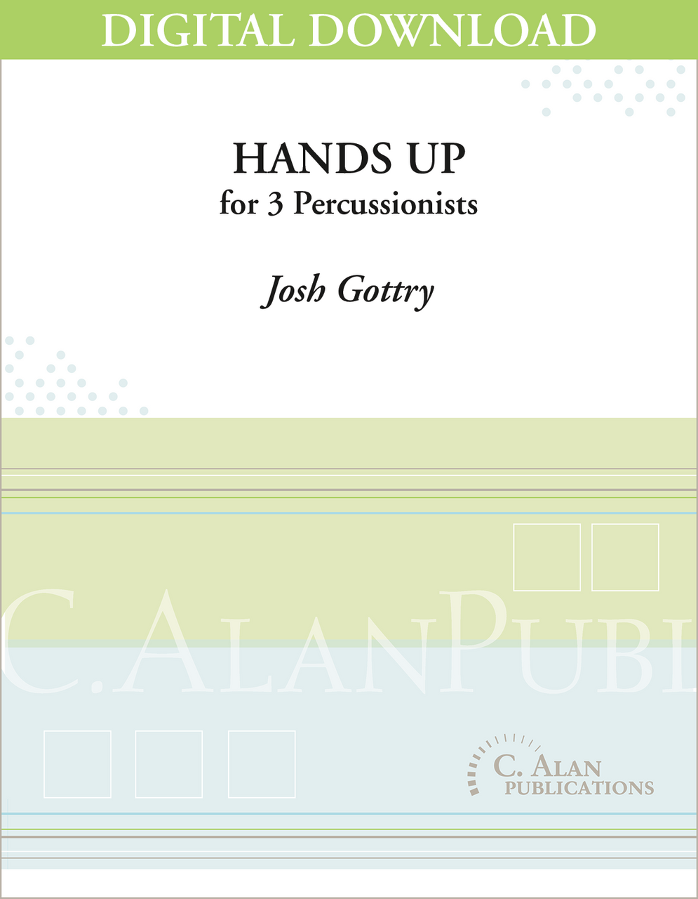 Hands Up is a conga trio based loosely on elements of west African djembe rhythms. The piece opens in 12/8 time with a unison statement from the ensemble, then alternates between layered patterns, solo sections for each players, and that original statement. The mid-section of the piece shifts temporarily into 4/4 time and each player utilizes a different implement (brush, blastick, or mallet) on the conga or conga shell. The original feel returns for a short reprise of the opening material. Listen carefully to the variety of sounds drawn from the conga by means of bass and dead strokes, open tones, and slaps.