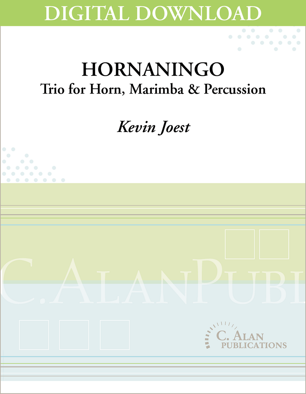 Based around an Afro-Cuban rhythm called the Naningo, Hornaningo is in a 6/8 groove, mostly present in the marimba part. The piece begins with the introduction of the groove and base melodic and harmonic material in the marimba, colored by the horn. The main melody actually enters about halfway through the piece, with low chords in the marimba and a soaringly poignant melody in the horn part. The piece’s dark nature is surprising, but it ends triumphantly with an amalgamation of the motives before it.