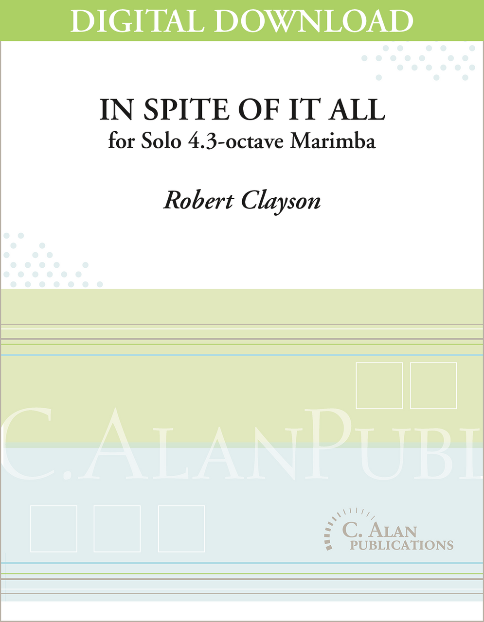 In Spite of it All was completed in the spring of 2020 and is a lullaby inspired by a new kitten the composer had fostered. The piece is intended for intermediate to advanced performers and gives the opportunity to explore the marimba's expressive and lyrical qualities.
