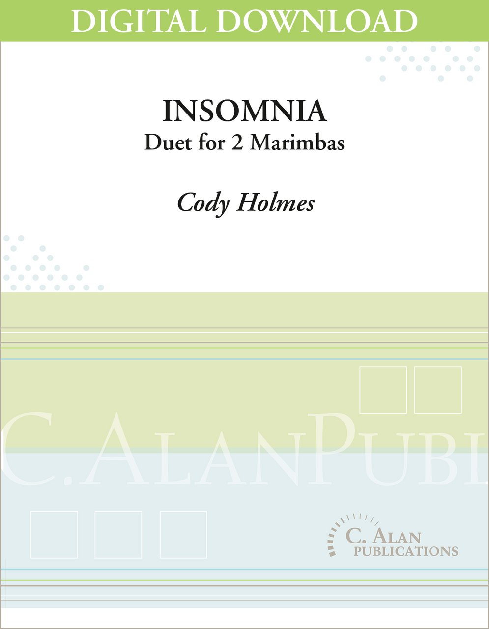 “Insomnia” is a challenging 7-minute work for two marimbists that demands technical prowess and acute chamber music skills to realize beautiful harmonies and melodic lines throughout. The piece is dedicated to the composer’s late father and is intended to “portray the free and flowing nature of the human spirit.” The work is set in a large three-part form (A-B-A), delineated by characteristic rhythms and texture. The opening and closing sections use quick sextuplet permutations, both in unison and as accompaniment against more spacious statements in the other player’s part. The unison statements are especially effective, as Cody Holmes exploits the large range between the two instruments and rich possibilities of harmonization. The melody/accompaniment phrases evoke an almost improvisatory effect, as a variety of rhythms (some non-linear) are juxtaposed by the melody part. The middle section is slower and is characterized by interlocking eighth- and sixteenth-note rhythms, with a strong emphasis on groove. Subtle quotations of material from the first section are used before sextuplet permutations begin to appear, issuing in the return of the A section.