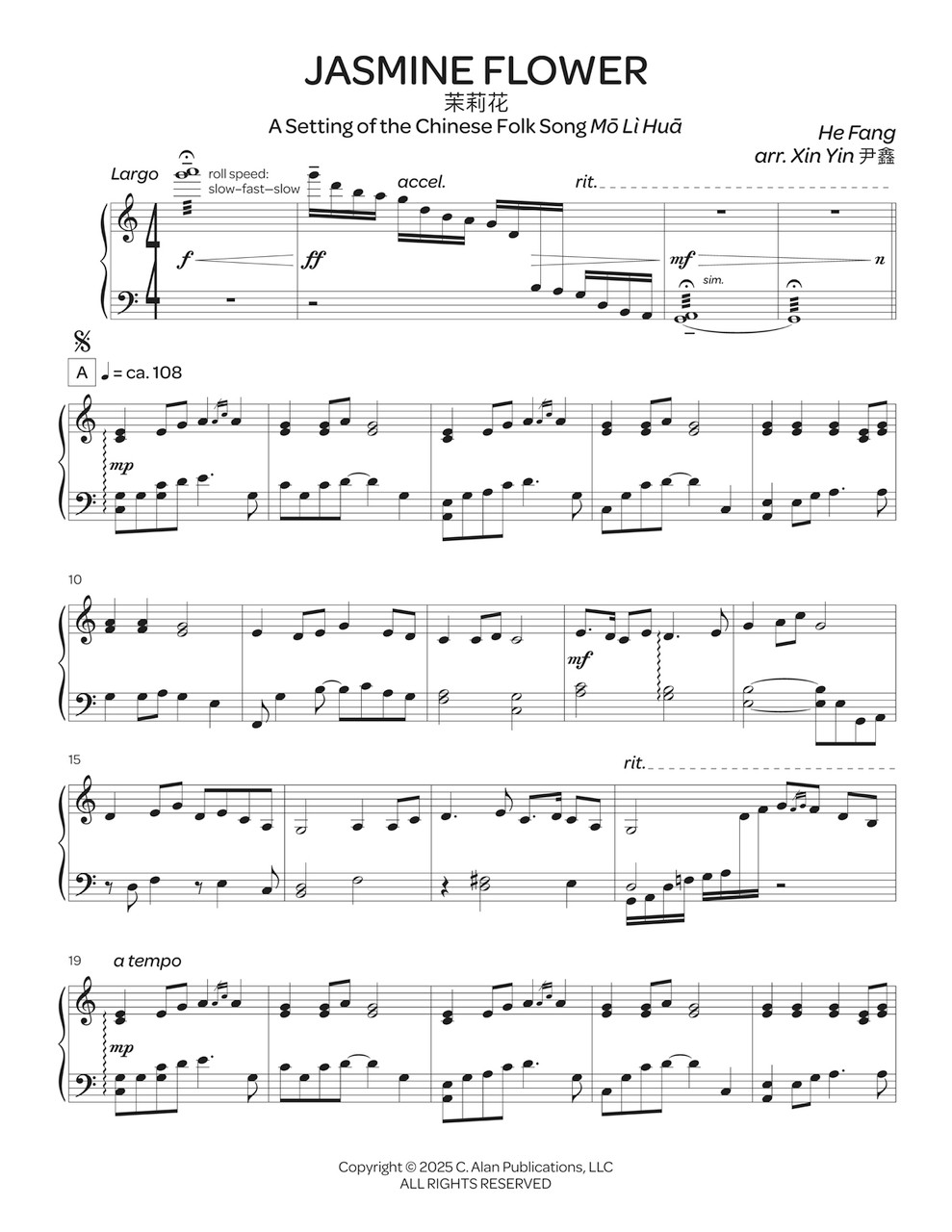 "Mō Lì Huā" (Jasmine Flower) is a beloved Chinese folk song often sung during holidays and festive gatherings. Yin incorporated ornaments inspired by traditional Chinese music, such as a gradual transition from slow to fast trills in the introduction and lively, rapid three-note trills that mimic the sound of the zhudi (Chinese bamboo flute). Additionally, dotted rhythms and quick, graceful slides reflect the expressive qualities of various Chinese instruments.