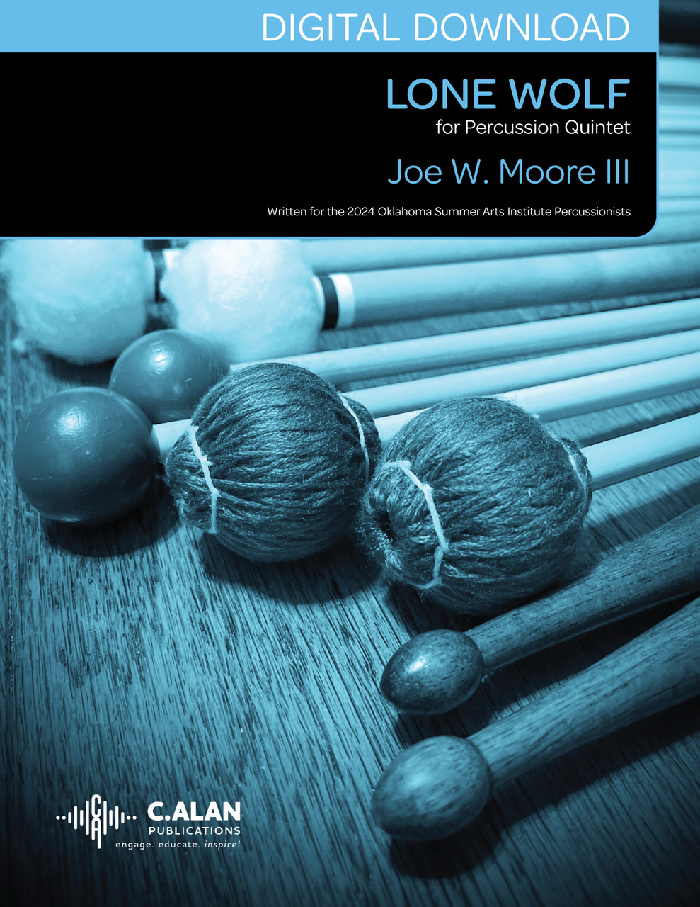 Lone Wolf was composed for the 2024 Oklahoma Summer Arts Institute percussionists and the title was inspired by the city of Lone Wolf, where OSAI is held. The piece brings together the shimmering metallic instruments and grounding rhythmic passages on the drums, to evoke the strength, resilience, and solitary spirit of the wolf in nature. Written for multi-percussion quintet, Lone Wolf is an exhilarating work that is engaging for the performers and audiences alike.