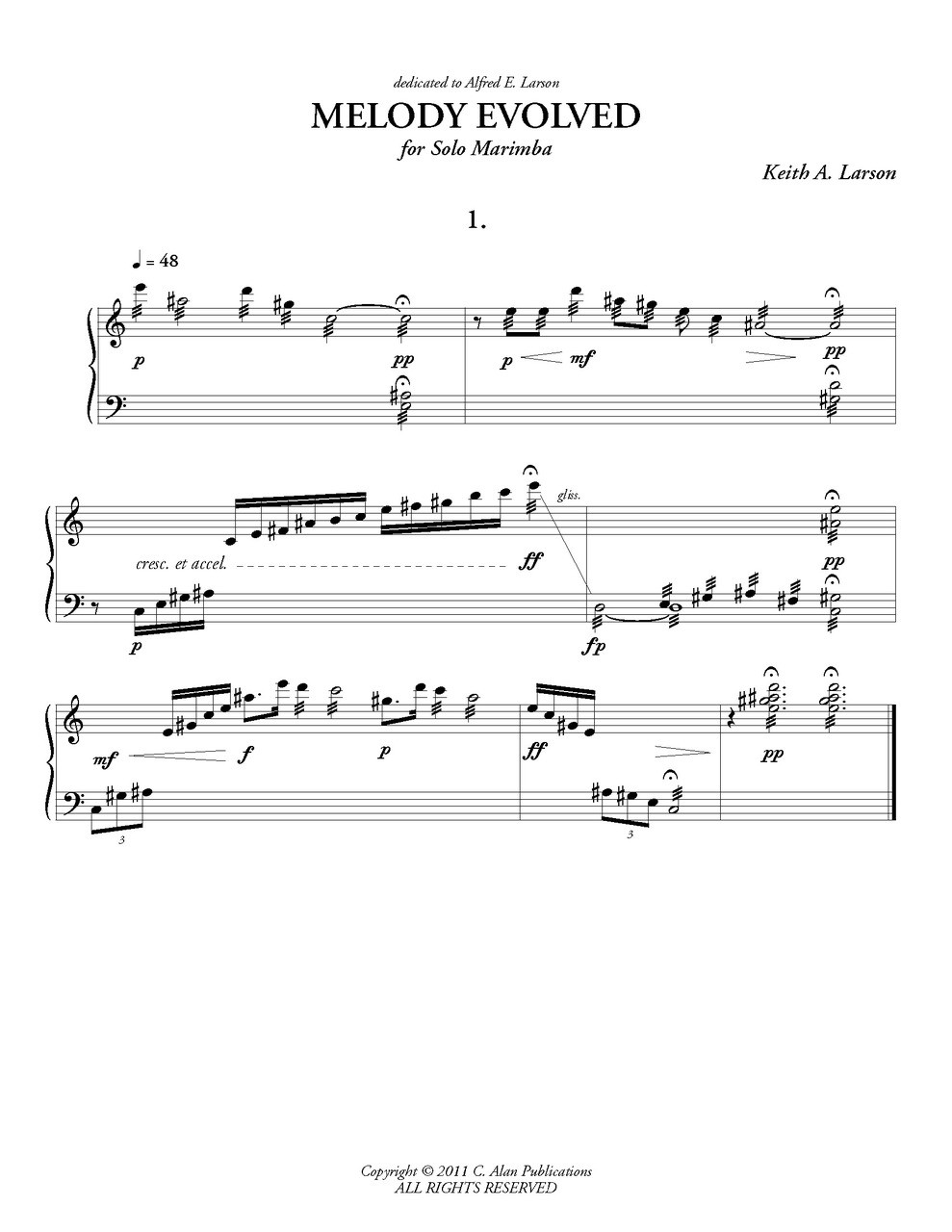 Melody Evolved is a collection of 5 intermediate level vignettes for solo marimba that is perfect for further developing 4-mallet technique in a musically challenging setting. Larson took a basic set of notes, and evolved them into a suite of 2 and 4-mallet pieces culminating in a grand chorale.