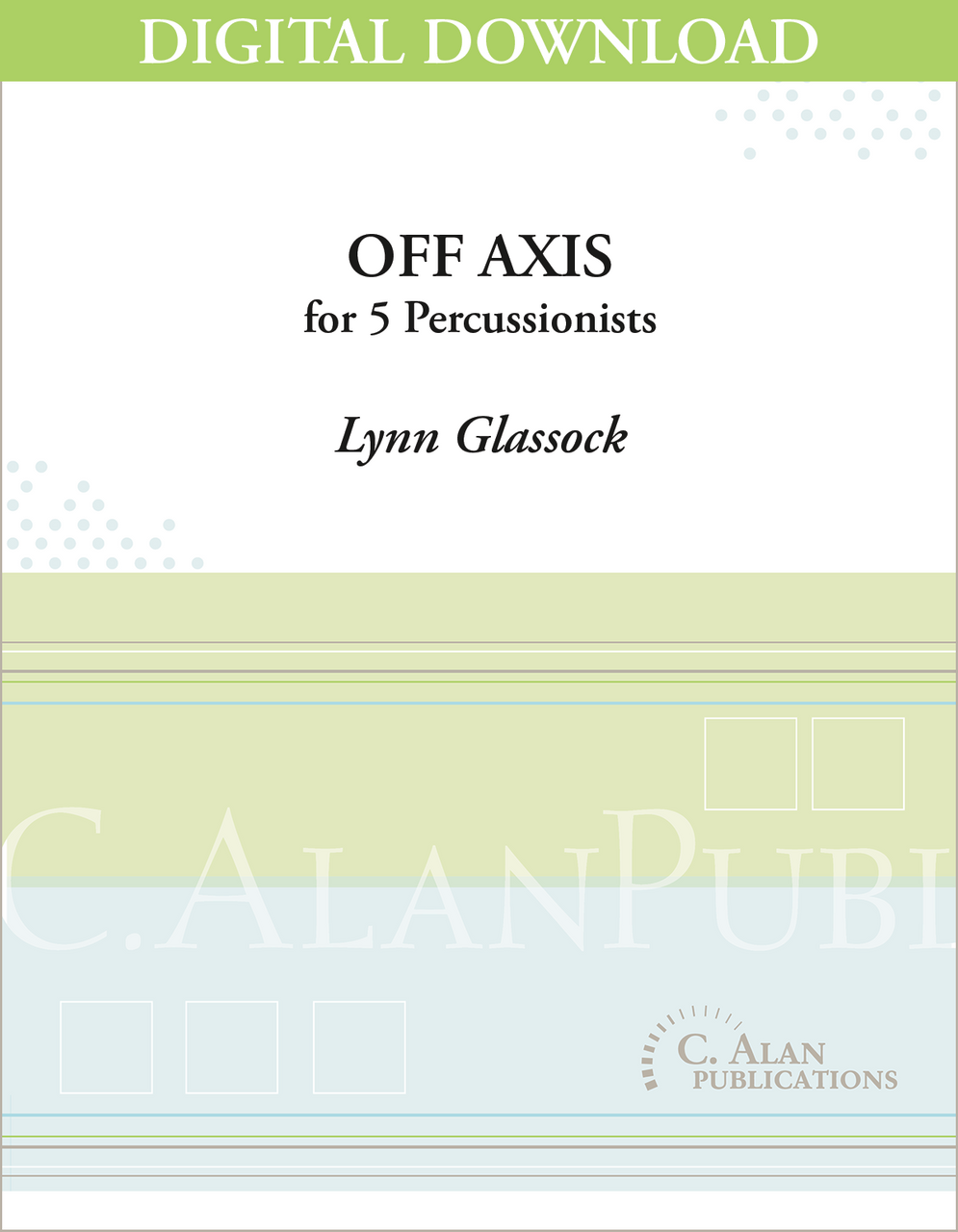 Off Axis includes an impressive virtuosic (yet idiomatic) solo part. Glassock uses the ensemble as a sounding board for the solo marimba with much rhythmic interplay and imitation. Constantly changing meters (4/4, 7/16, 9/16, 3/4, etc.) before settling in 4/4 for the drum solo section. Wonderful piece for a university student recital or for the professional.