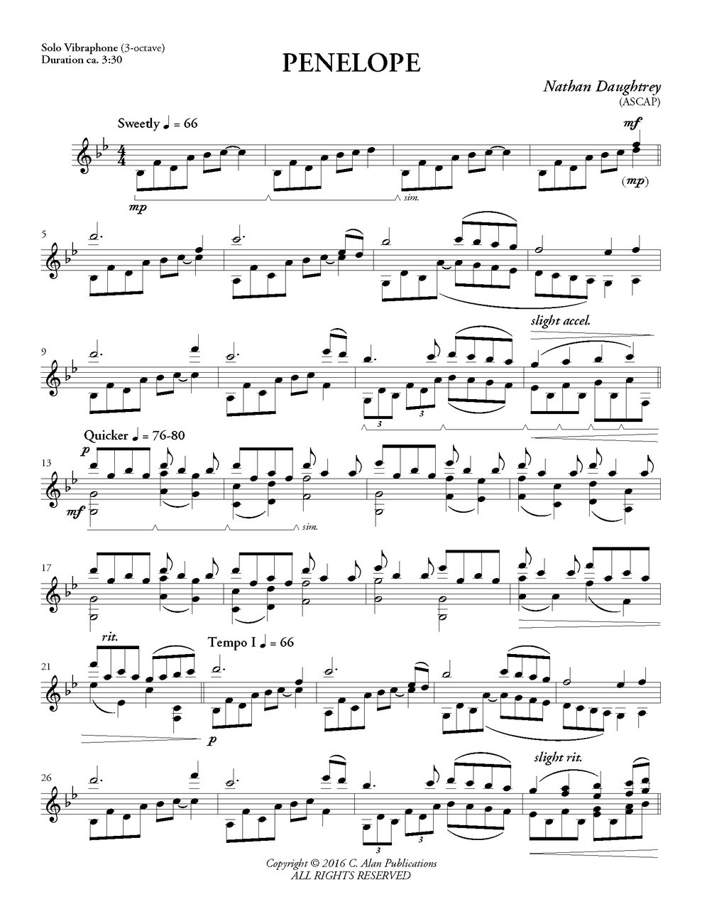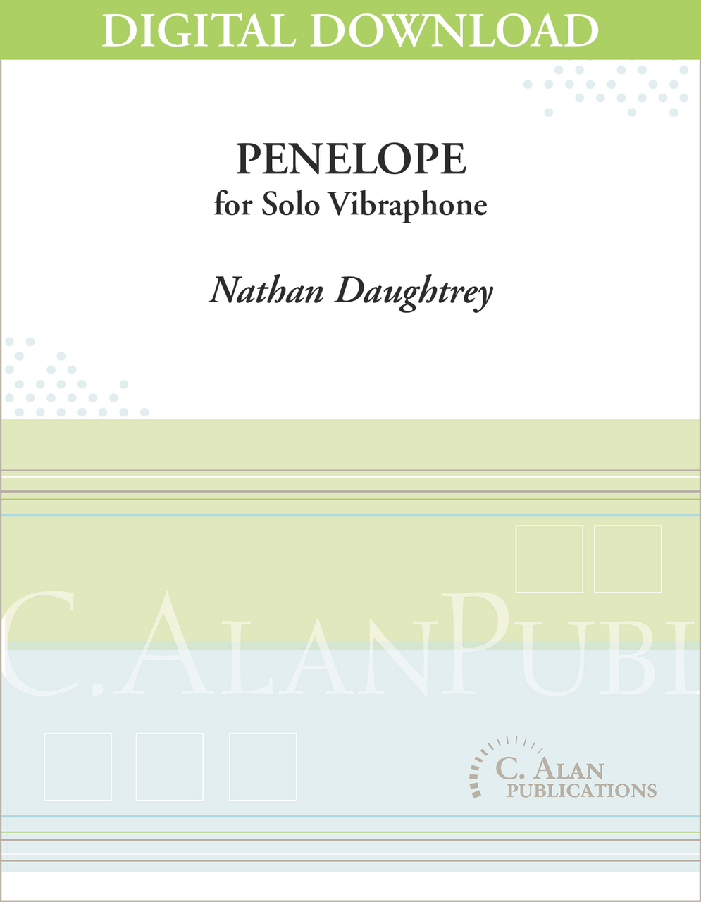 Penelope is dedicated to my beautiful baby daughter, born on May 9, 2016. Originally titled “Lullaby for PJ” and conceived as a duet for bells and vibraphone in the collection “Duology: 10 Duets for Young Percussionists,” the piece has been expanded to explore more chromatic harmonic progressions while still maintaining the beauty and simplicity of the original lullaby.