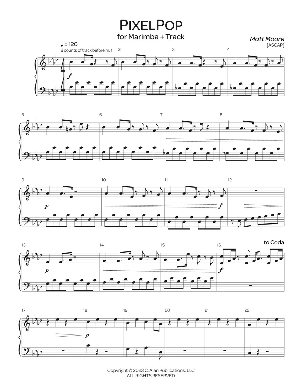 PixelPop is an energetic 4-mallet marimba solo that features a chiptune accompaniment track using the sounds of retro video game music. Press up, up, down, left, right to start with 99 lives.