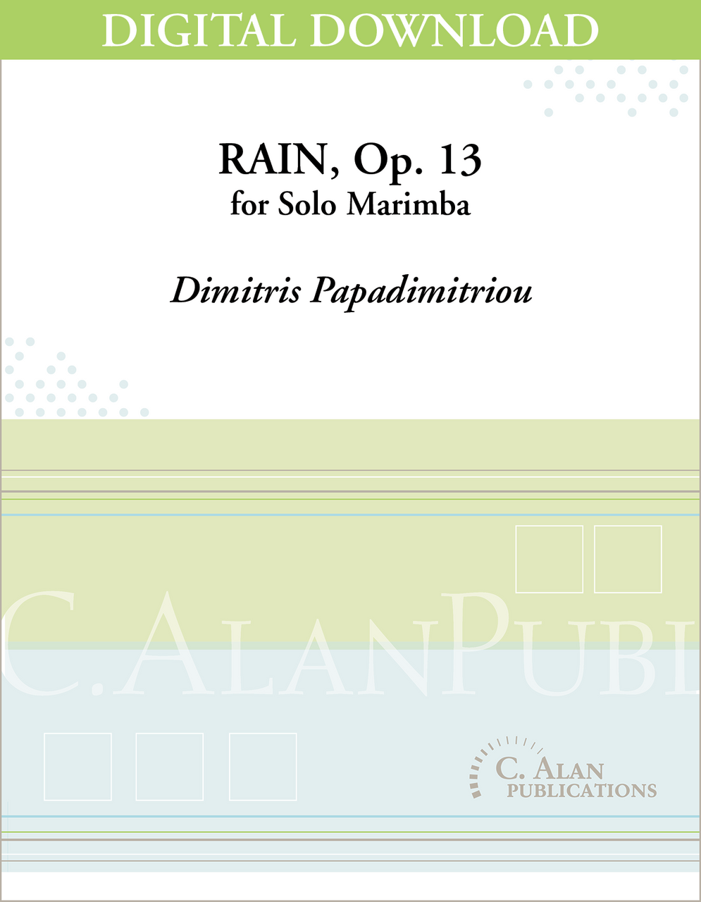 Rain is a dark & lively marimba solo set primarily in 8/8 (3+3+2) with brief, dramatic rolled sections interspersed throughout. Catchy, toe-tapping melodies will have your audiences humming all the way home.