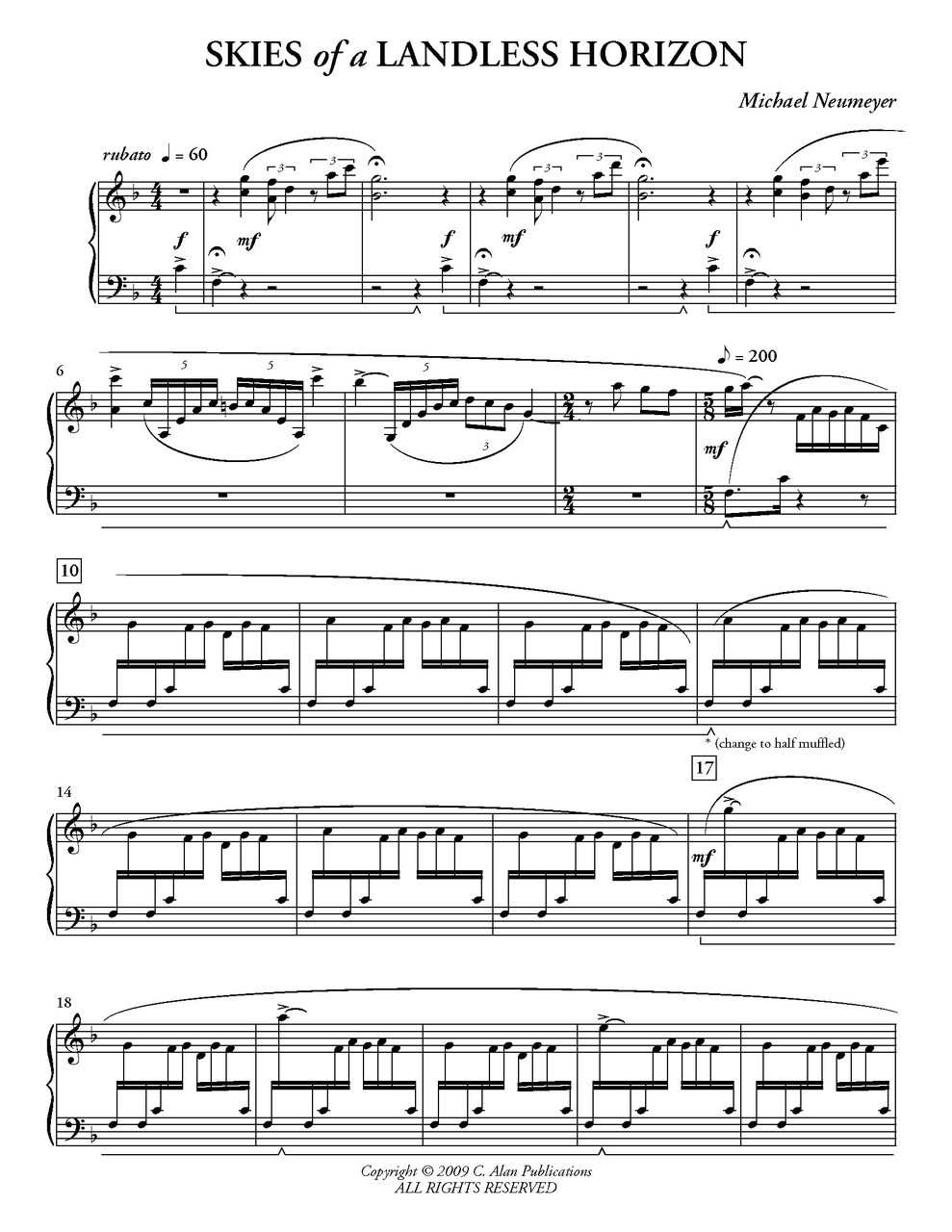 Skies of a Landless Horizon is a piece that blossomed quickly, with the musical themes and ideas existing before the title of the piece. When I reflected on the feeling that playing the music gave me, I pictured a sunrise. The exact sunrise was one over Lake Michigan from the harbor of Port Washington, WI. The way the sun looks when its first appearance of the day is uninterrupted by land is a magnificent sight. I am confident that this vibraphone solo captures the awesome brilliance of the landless sunrise as well as its beautiful subtleties.