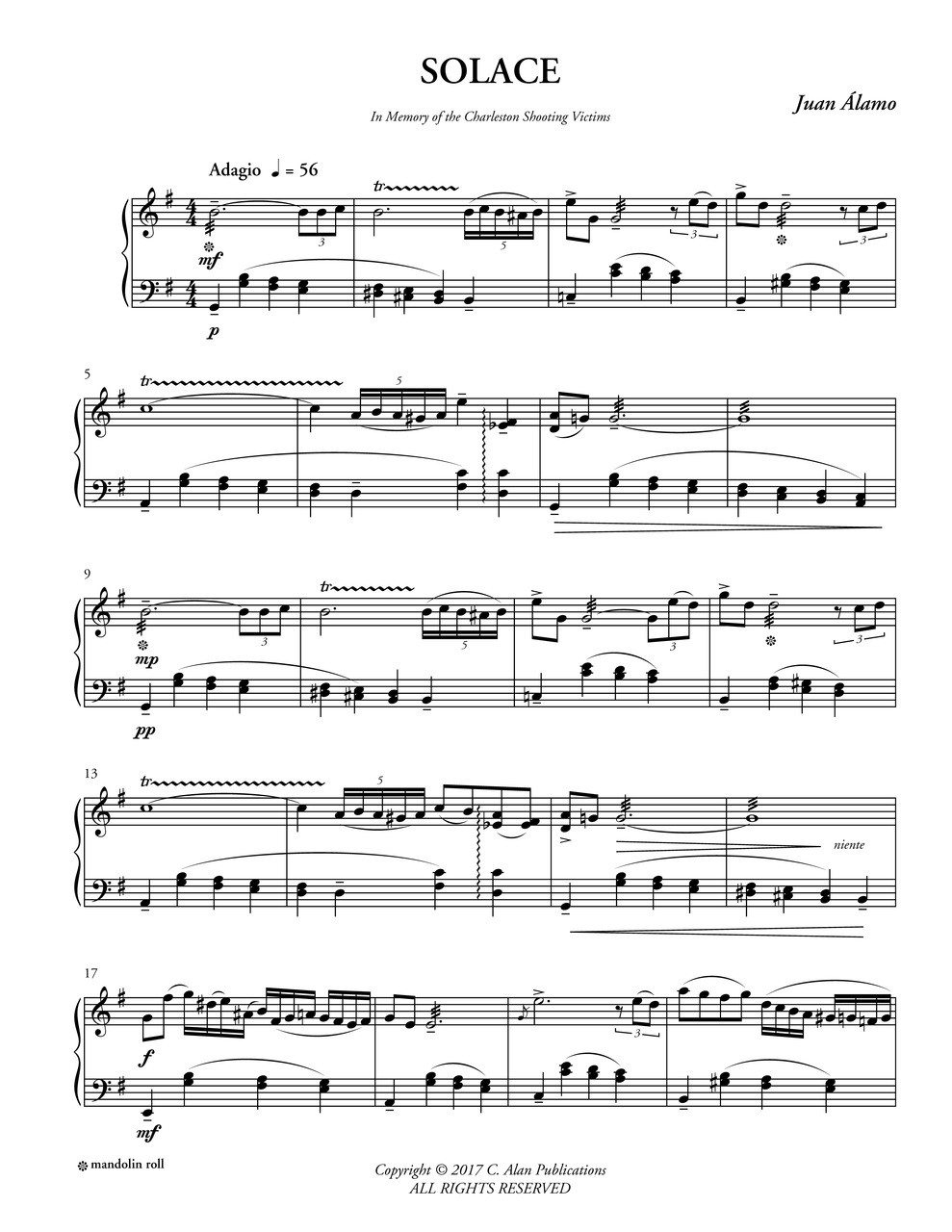 Solace was written to honor the victims of the Emanuel African Methodist Episcopal Church shooting in Charleston, South Carolina in June 2015. Upon hearing this tragic news, I felt compelled to improvise something to pay homage to those who perished that day. Unfortunately, in recent years we have seen an increase on violence, oppression and lack of tolerance in our society. Thus, Solace is a musical depiction of my feelings of sadness, grief, and desolation in regards to tragic events like the Charleston shooting. Furthermore, Solace is an invitation to everyone to work towards a peaceful society.