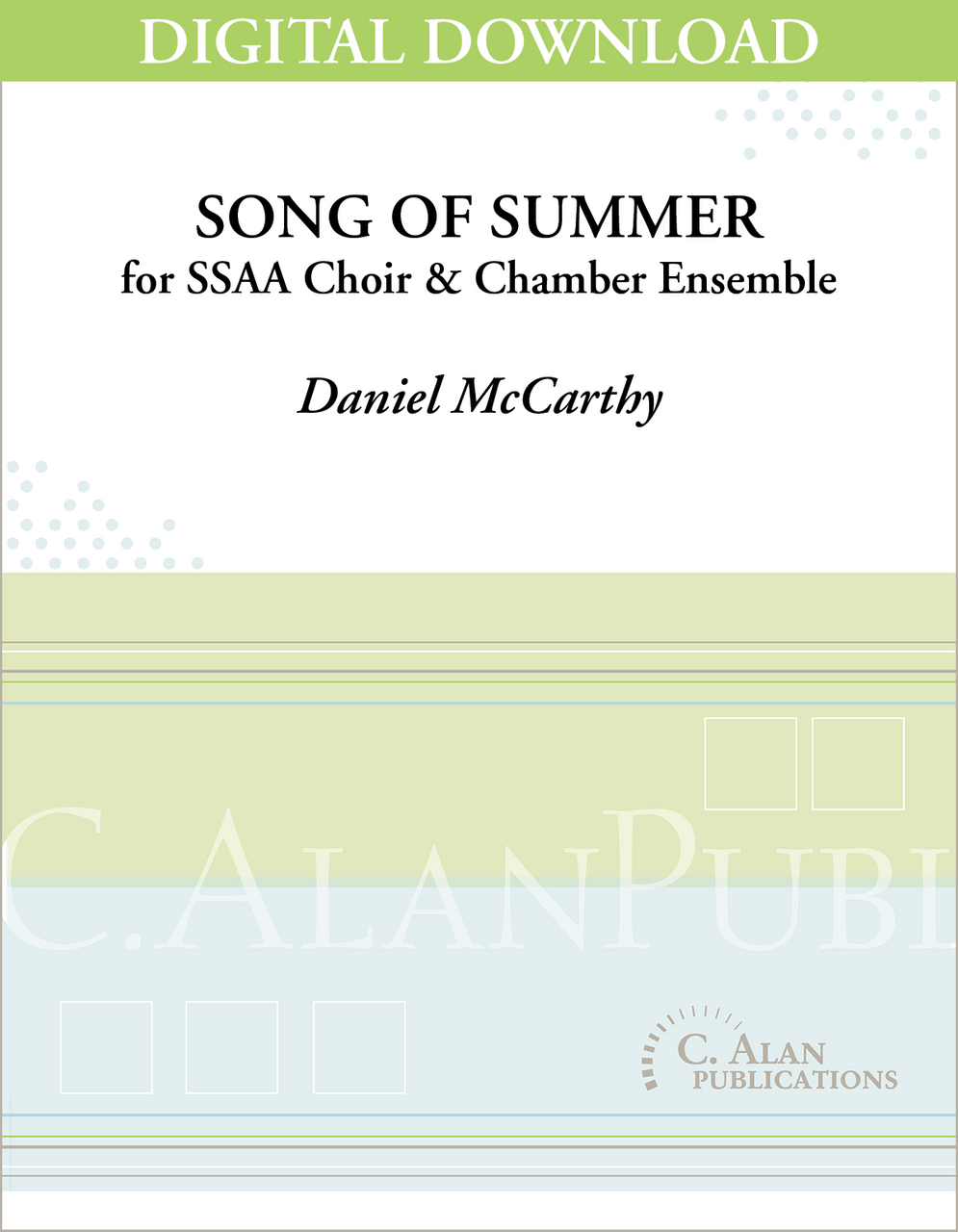 Song of Summer was written for the Interlochen Arts Camp Intermediate Treble Choir, Richard Phelps, director. The composition depicts four aspects of the experiences of middle school girls in Interlochen Arts Camp's Intermediate Division. The text is original and is dedicated to the composer's two daughters Alannah and Siobhan, who were Intermediate Girls for several years at Interlochen.