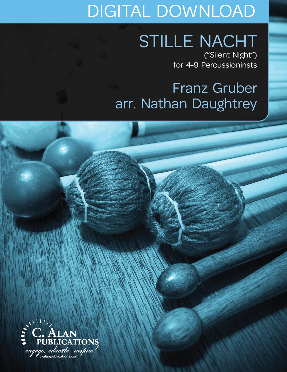 Originally scored for marimba quartet, this arrangement of the ever-popular Christmas carol Stille Nacht (”Silent Night”) has been re-imagined for mixed keyboard quartet with 5 optional parts, including chimes, timpani, and 3 auxiliary percussion. After a brief, reflective introduction, the marimbas provide a warm eighth note ostinato while the bells and vibraphone float the simple, slightly re-harmonized melody on top. The metals and woods then trade roles with a more stately presentation of the tune in the marimbas, which leads to a breathtaking climax. The arrangement concludes in much the same way it begins – with the peace and quiet of a silent night.