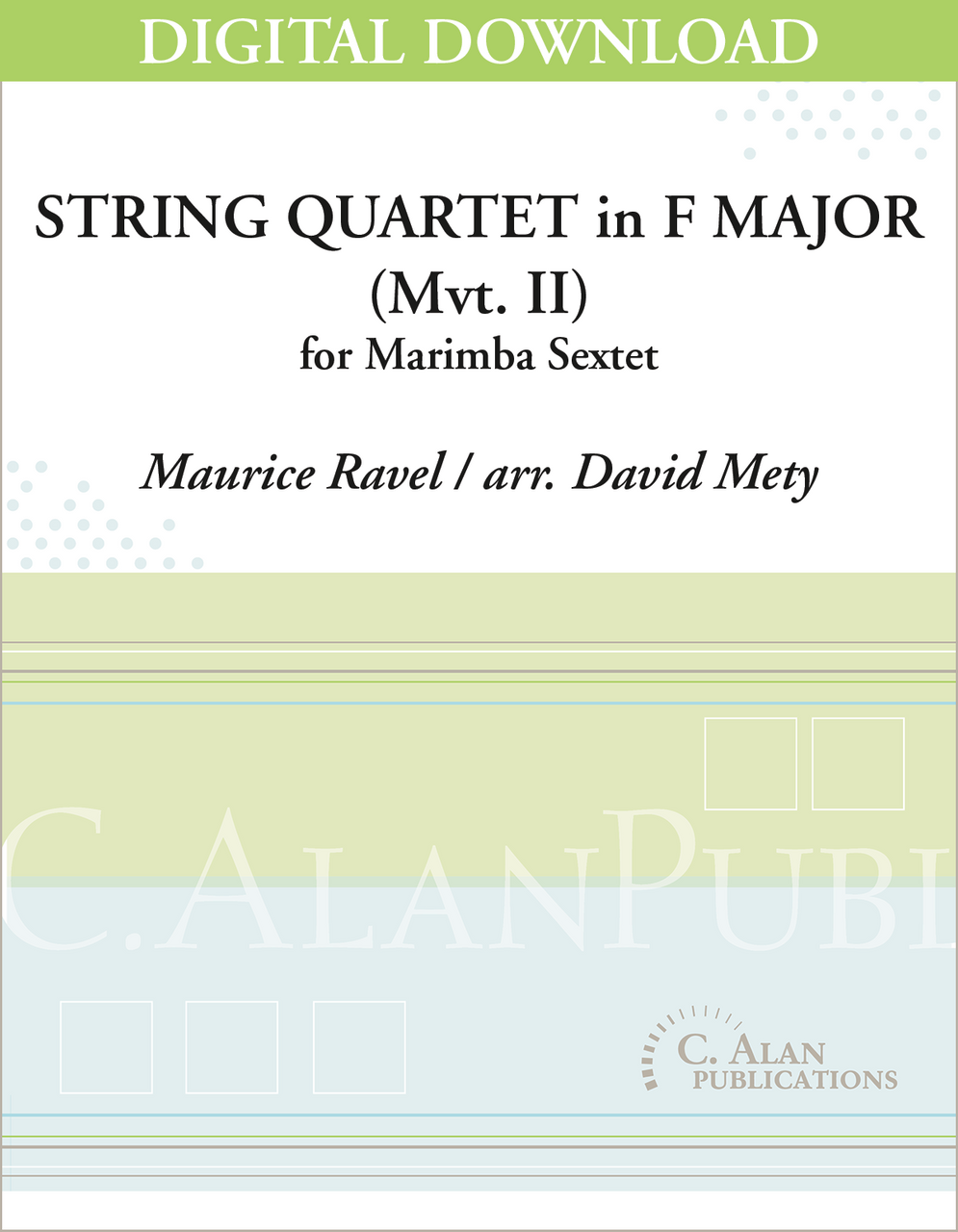 String Quartet in F Major was written by composer Maurice Ravel in April 1903. The second movement of the work, titled Assez vif – très rythmé, is a scherzo and begins with a very playful pizzicato passage. It also features polyrhythms created by alternating between 6/8 and 3/4 time signatures. While the meter does not change in the arrangement, the marimbas will create the feeling of that change with their accented parts. The central section of the movement is a very slow, wistful version of the main thematic material, followed by a shortened reprise of the opening section. Six marimbas were utilized for this arrangement but may be replaced by other mallet instruments if needed to accommodate different ensembles and instrument availability. Additionally, any of the parts can also be freely doubled to expand the piece for a marimba orchestra as well.