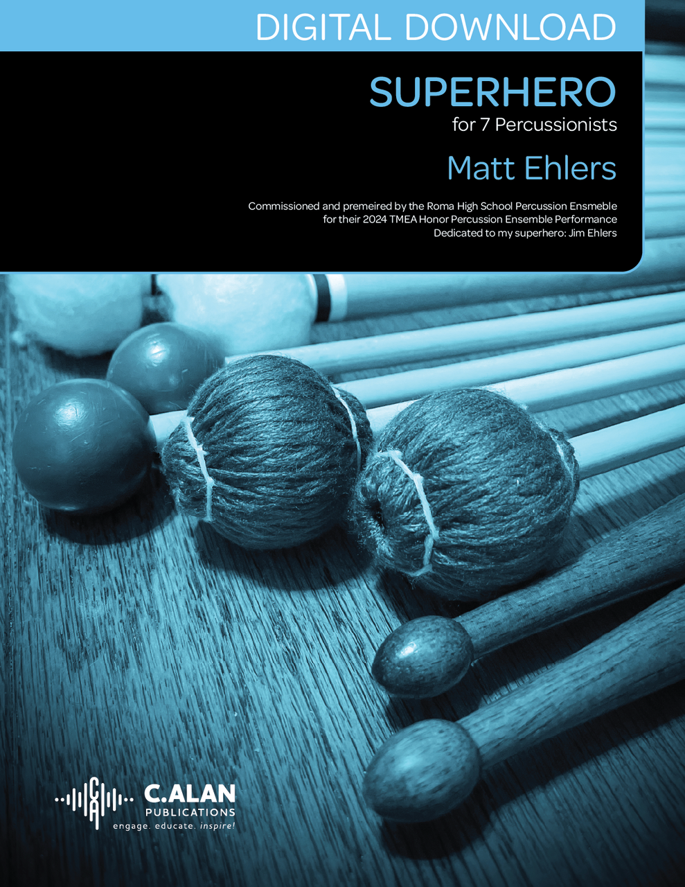 This exciting and challenging percussion septet uses heroic chord progressions throughout which gives a cinematic quality. Each player is given an opportunity to shine and the ensemble is full of interesting textures. Superhero is great piece if you are looking to showcase seven of your top students!