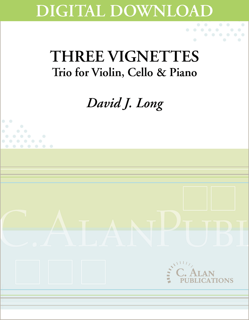 Three Vignettes is a single-movement work for violin, cello & piano that divides into three contrasting sections (or vignettes) – the first is rather dark and rhapsodic, the second is beautifully flowing and driving ahead, and the third features driving ostinatos and merges the themes from the previous two sections.