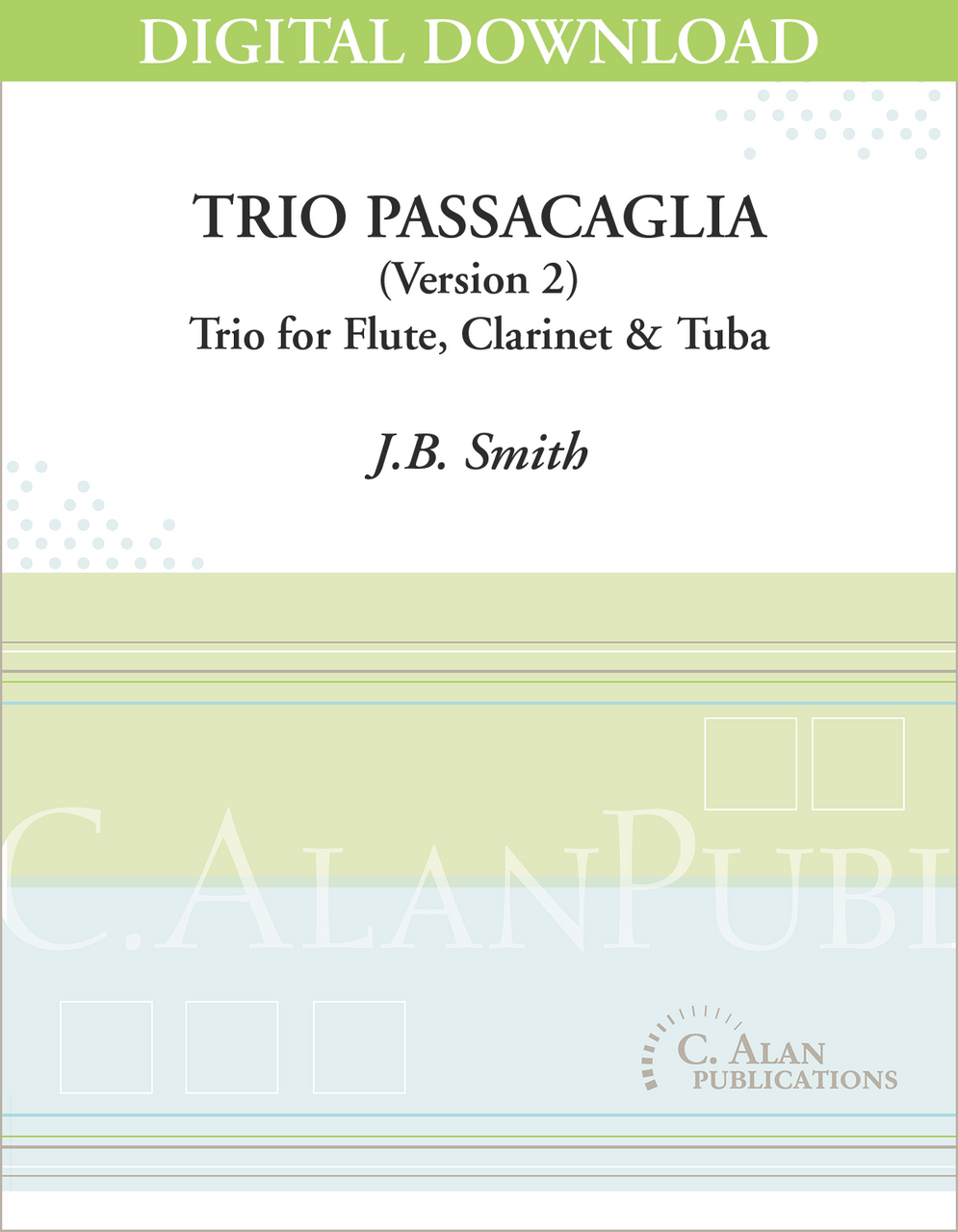 Originally written for vibraphone and two marimbas, Trio Passacaglia is based on a repeated four-note motive in the tuba, which is subsequently embellished. The flute and clarinet have playful interchanges above, which become more and more animated leading to the added involvement of the tuba.