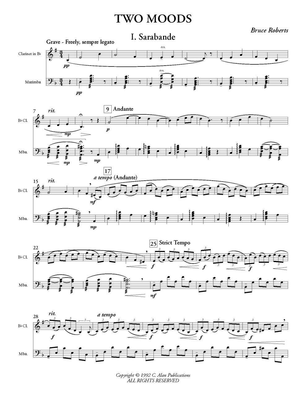 Two Moods for Clarinet & Marimba features a constant blending and interaction between the two instruments. The two movements/moods imitate characteristic forms and rhythms of Baroque dances while incorporating modal harmonies of the 19th and 20th centuries. At times, this unique combination appears jazz-like and should be exploited to its fullest potential.