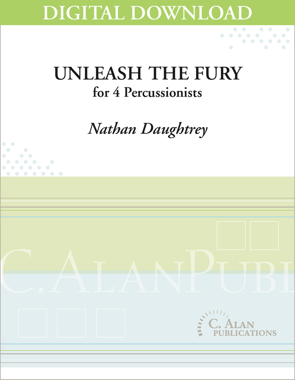 Unleash the Fury is a tour-de-force for marimba quartet. The driving accented sixteenths throughout create an atmosphere of tension and excitement. A slow, mournful rolled section is found in the middle of the piece in a quasi-fugal setting. The piece concludes with the excitement of the opening of the piece.