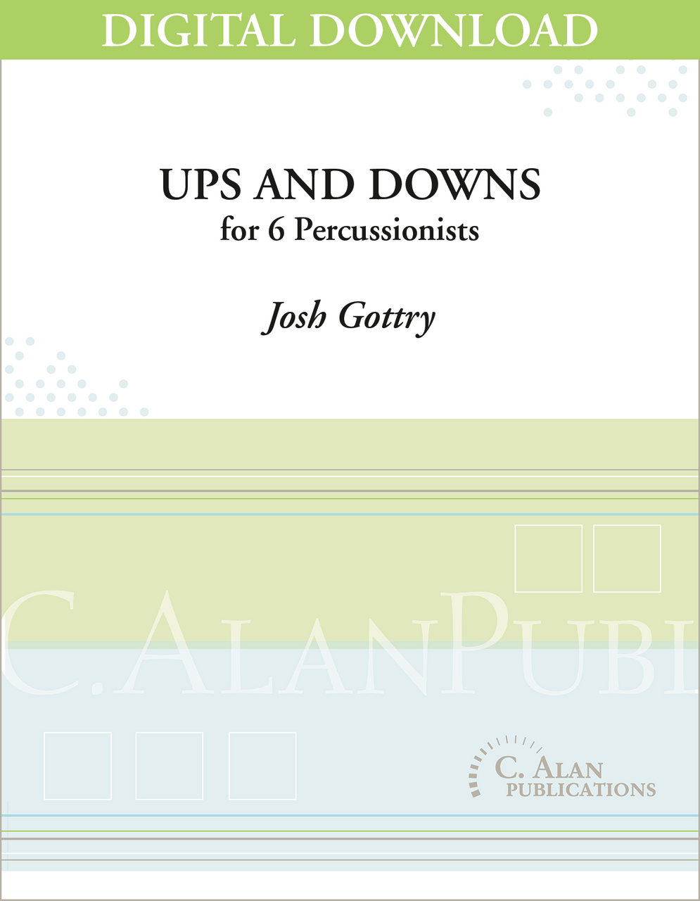 Ups and Downs is a groove-based work for easy to intermediate percussion ensemble utilizing relative high and low pitches on non-pitched world percussion instruments. Opening with the signature bell part from the 6/8 Afro-Cuban style over which is layered a complementary block part, the drums enter with an aggressive unison statement before the piece explores a variety of layered textures, call and response statements, and rhythmic dialog. This is an excellent work for introducing students to instruments not regularly included in standard band literature and allowing them to experience the metric flexibility of the 6/8 time signature while also providing the flexibility of either a smaller chamber ensemble for six players or a large ensemble with any or all parts doubled or tripled.