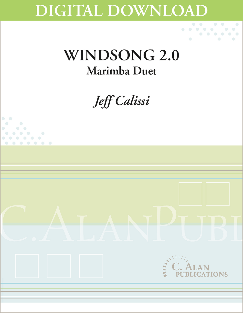 “Windsong 2.0” is a marimba duo based on a movement from Jeff Calassi’s solo piece, “Windsong.” This duet requires two 5-octave instruments and is a joyful contribution to marimba literature. This rhythmic and tonal piece features shifting meters in an interesting King Crimson-meets-the-marimba style. Repetitive rhythmic groves are featured liberally as are octave passages and rhythmic interlocking.